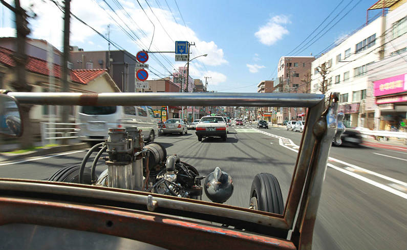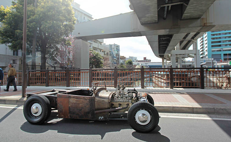 If you happen to be in Yokohama, you may see a vehicle that depicts Japanese tradition and western spirit at the same time. Then, you should know that it is the “Kid Rocker” and it is built by Mr. Mitsui. Besides our experience with drives in many, many cars of all sorts, the ride in this 1929 Ford Model A Roadster Pick up (RPU) was the most exciting of them all. Even though the car is minuscule, it is well perceived by all passengers on the streets. And that says a lot, since in Japan even if you run naked on the streets, you will get zero attention.