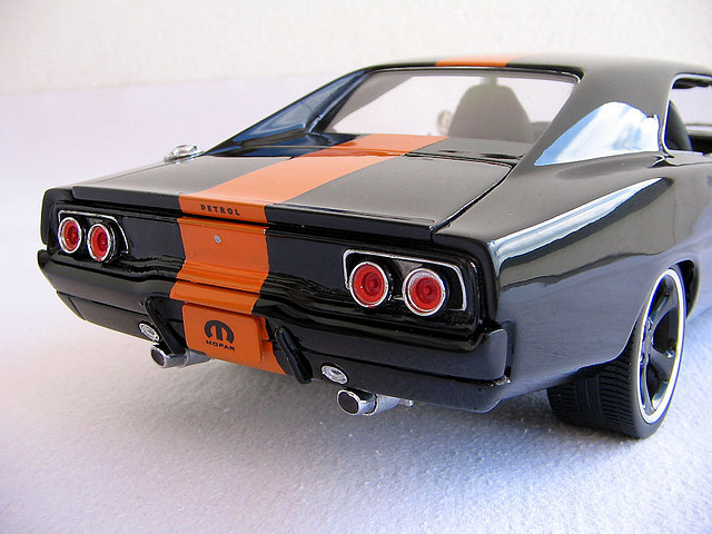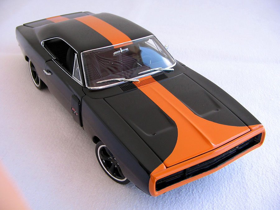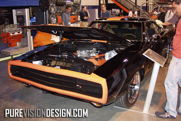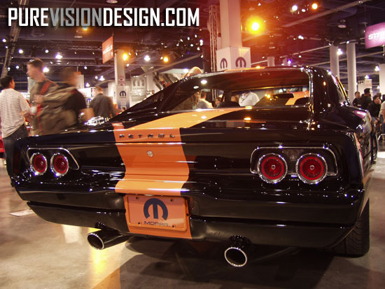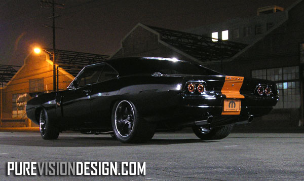 The interior is derived from a 1971 Charger, but changed with Redline Work gauges and some other stuff. It is black with an orange shade, which is impossible to miss. The original seats are now custom-made covers. The taillights are also modified.