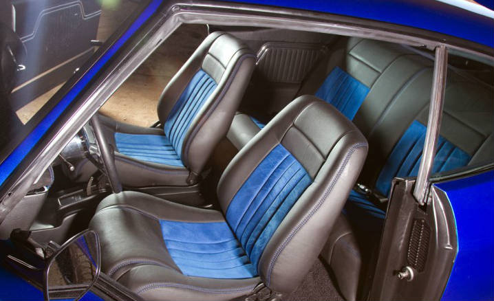 Inside: Suede 2-tone interior, custom leather and Top Stitch Upholstery`s blue contrast stitching.