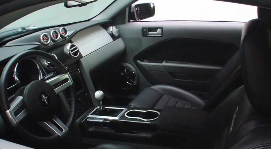 The interior of this 2007 Ford Mustang Eleanor hasn`t been a lot modified. The Mustang buckets covered in black leather that come along with the vehicle are standard. The steering wheel accents and the dash are silver as well as the exterior paint. The awesome part of the interior is the white cue-ball Hurst shifter. The pedals are Saleen units, there are Mustang-branded kick plates on the sills and a Clarion touch screen unit is put instead of a stereo.