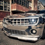 A company from the Czech Republic called “Tintek” presents its chrome wrapping for the Chrome Chevrolet Camaro. This Camaro has been wrapped up in 3-D foil over its original paint basis. The foil is reflective.