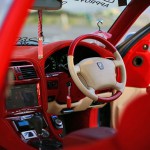 It is fact that Mizuno-san has put a lot of effort into the external appearance of the car. But, it is also a fact that he has done as well with the interior. Everything inside is either in beige leather or in fiery red including the seatbelts. It is unbelievable how much attention has been paid to the details. It`s absolutely incredible! There are customized stereo and air conditioning systems, LCD screen with red details (so it fits to the general internal surroundings), a Bulgari clock and an original shifter made of leather and material characteristic for Louis Vuitton. If you are a passenger sitting on the front side then you will get your own LCD screen. And of course the curtains are present here, as in any other bippu style car. Not only the curtains protect you from the strong summer sun, but they also hide your identity from the curious passersby.