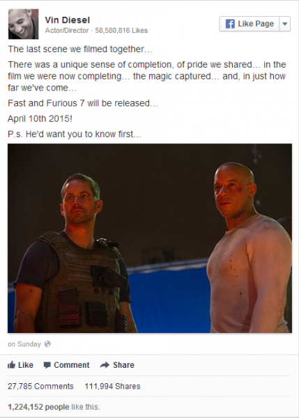 Vin Diesel announced that the Fast and Furious 7 release date will be on April 10, 2015. Originally it was stated that movie will have premiere in July 2014, but it was put on hold after the Paul Walker‘s tragic death on Nov. 30. Check the first official poster of the F&F 7. As you know Paul Walker plays the agent Brian O’ Conner and the co-star Vin Diesel posted their final scene photo on his Facebook page. You Can see the screen shoot bellow.