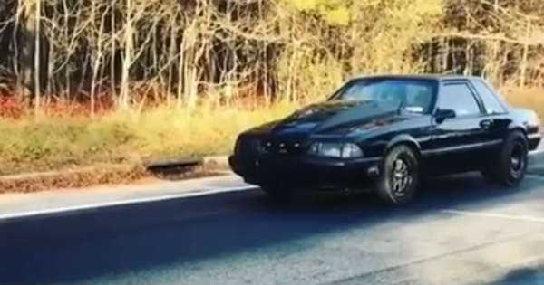 As you know, in drag racing, there`s nothing more dramatic and awesome than a wheelstand. The front wheels are high in the air, and the rear times slammed into the pavement. This is the decisive moment that`s between glory and disaster. You can also hear the monstrous engine inside this Ford Fox Body Stang. We can`t tell for sure what engine lurks inside, but we suppose that this is an LS swapped Fox Body Mustang.