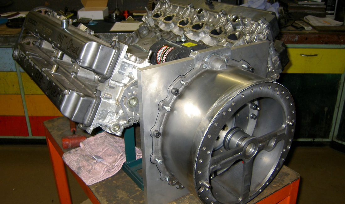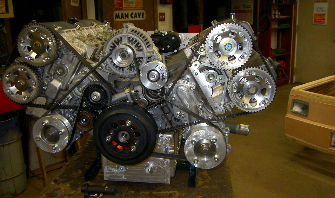 First he cut the bottoms of two 6 cylinder Toyota Supra motors, then machined, stressed, welded and finely balanced a crankcase for exactly 120 degrees. He has also purchased a custom built crankshaft from Scat with a SB Chevrolet main and Honda rod bearings, as well as Honda H-beam rods. By using modified Toyota oil drain back holes, he bolted the cylinder block. There are also common ports at the center of the engine, and just for the sake of fun, he placed the exhaust ports at the center also. And after few other original decisions, the final result is this 5 liter, 300 CI Turbocharged that should generate 800 HP!
